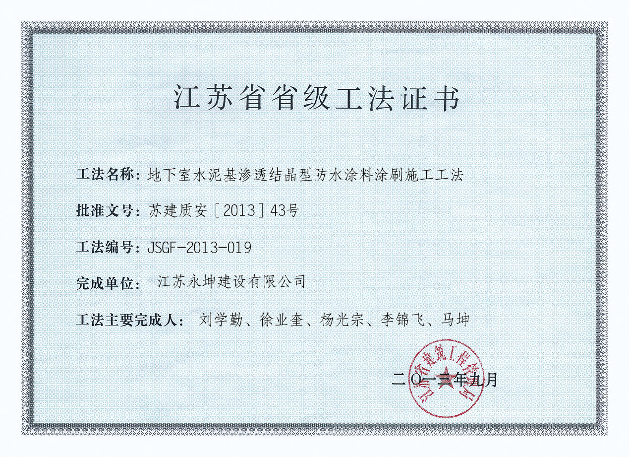 江蘇省省級工法證書